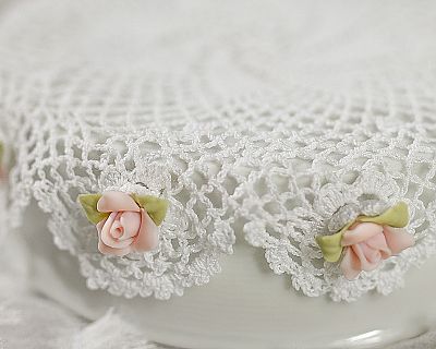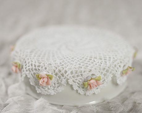 This fine porcelain base matches many of of our figurines. It features a cute vintage doily and small porcelain rose all the way around the base. Base fits figurines with a base diameter of up to 3 3/4″ width. It is available in white.