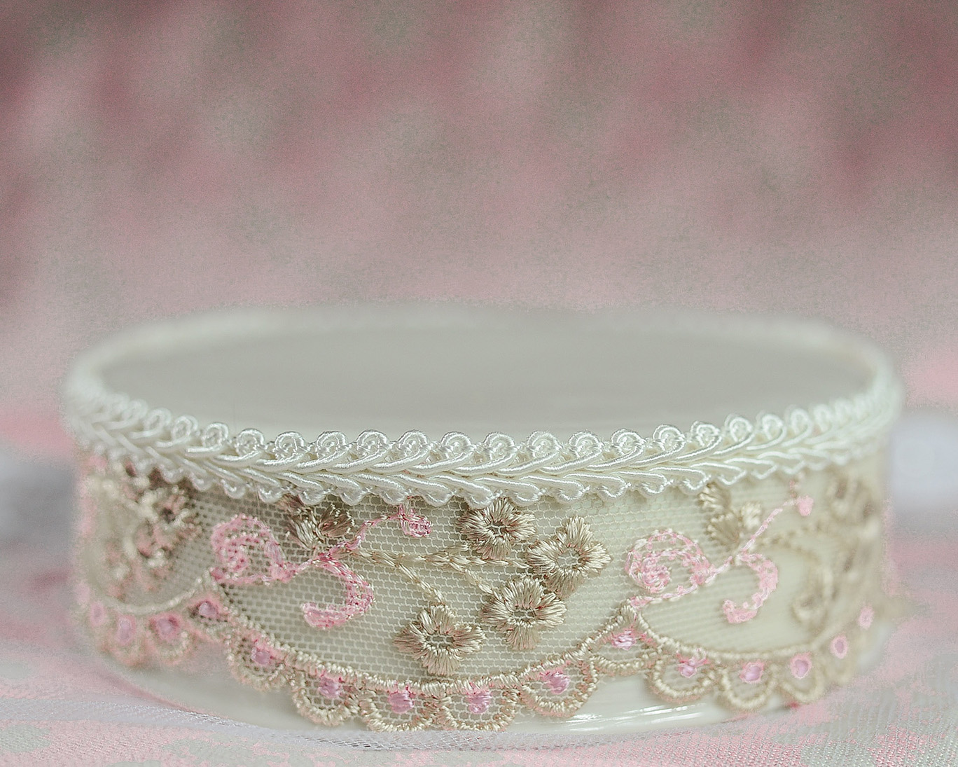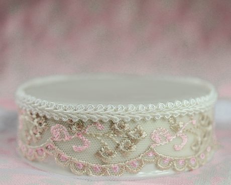 This fine porcelain base matches many of of our figurines. It features a delicate French pink and brown lace trim all the way around the base. Base fits figurines with a base diameter of up to 3 3/4″ width.