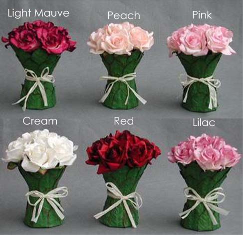 This beautiful centerpiece features a bouquet of natural paper roses nestled in a rich leaf lined base. Perfect finishing touch for your wedding reception or bridal shower. Available in Peach, Pink, Cream, Red, and Lilac. They also make wonderful wedding cake toppers! Order a minimum of 6 per color.