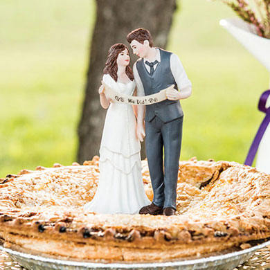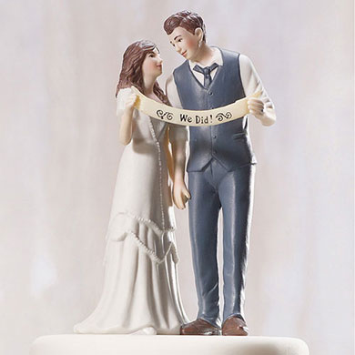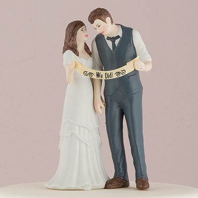 This trendsetting Couple’s style is cool and classic. The retro inspired attire and hairstyles are practically perfect for vintage themed weddings. This Couple stares lovingly into each other’s eyes while confidently holding up a banner declaring “We Did!”.