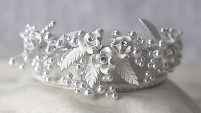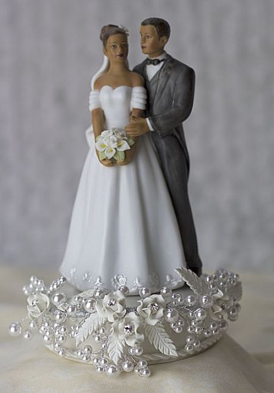 This stunning recreation vintage cake topper features a sprig of rhinestone studded roses in a sea of faux pearls accented with fine gold or silver wiring. It compliments our elegant African American cake topper. The base is made of fine porcelain and is covered with roses and pearls. The base is available in ivory with gold wiring or white with silver wiring.